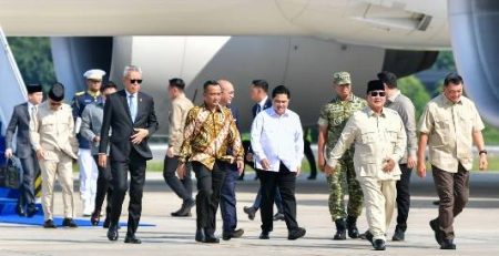 Pesawat Garuda Indonesia-1 yang ditumpangi Presiden Prabowo, tiba sekitar pukul 14.39 WIB. Presiden, tiba bersama Menteri Luar Negeri Sugiono dan Seskab Teddy Indra Wijaya.