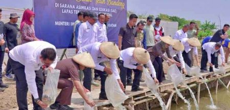 Menteri Imipas Agus Andrianto melepas benih ikan di Lapas Terbuka Kelas IIB Kendal (foto: irf/prv)