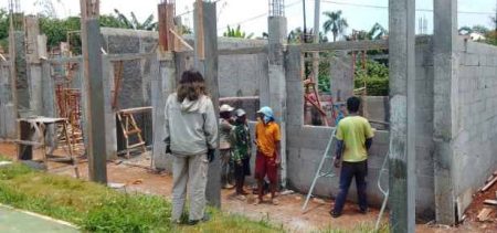 “Iya ini bikin toilet, siapa bos nya saya tidak tahu pak, tidak ada Bos. Coba itu tanya, sama yang lagi kerja di atas,” katanya sambil menunjuk ke atas atap toilet.