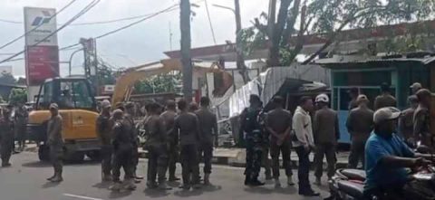Satpol PP Kota Depok Menertibakan Bangunan Liar di Kawasan Jalan Akses UI pada Senin (22/12/2025). (Foto: irt)